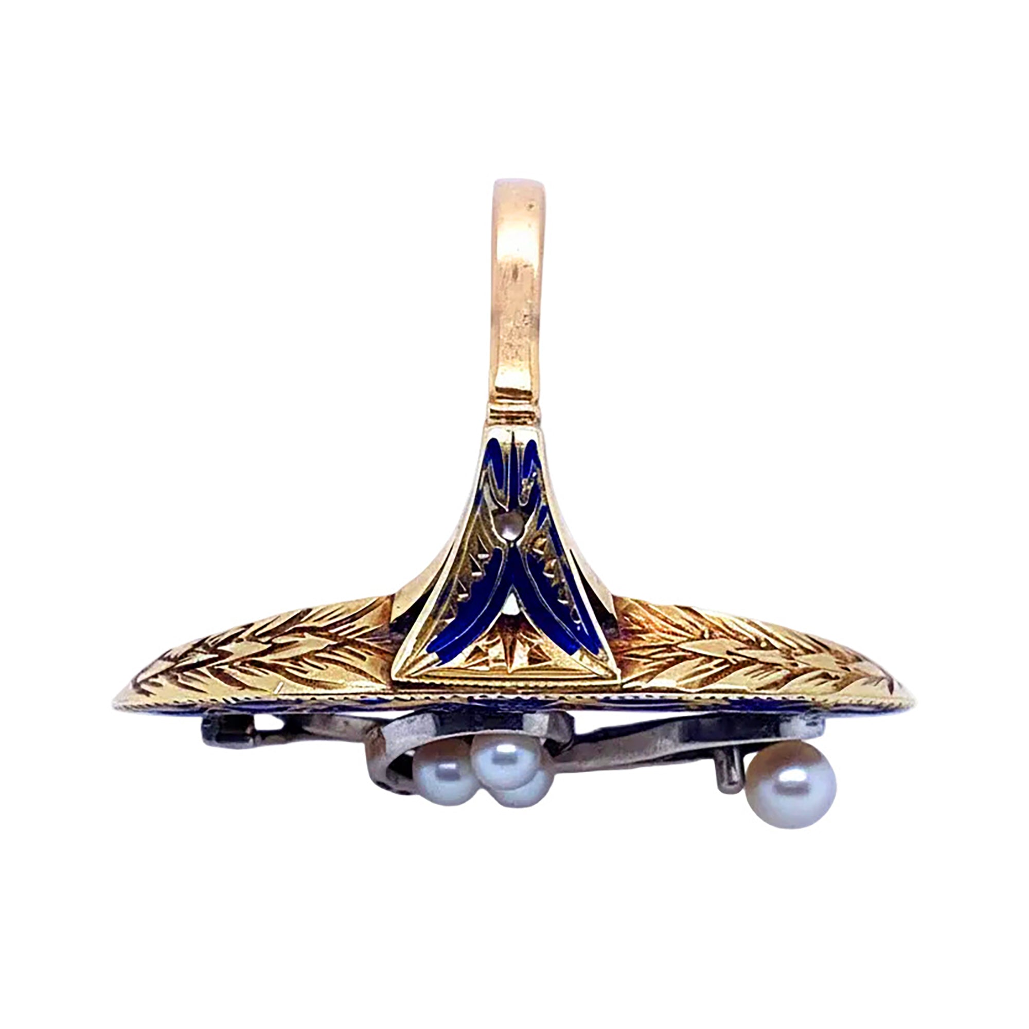 Anello vittoriano in oro, diamanti e perle smaltato blu del XIX secolo.